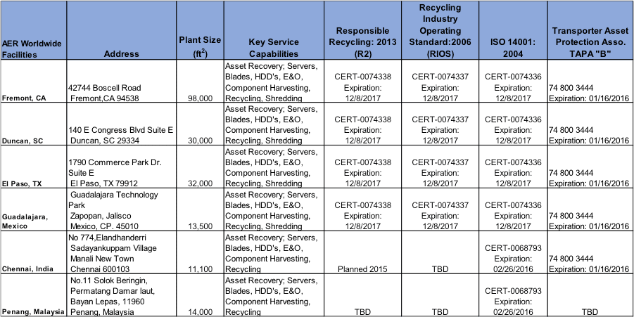 AER拥有的设施是ISO 14001认证和北美设施是R2 / RIOS认证。他们的所有设施都是Tapa-B认证,入口受到安全性紧密控制的。