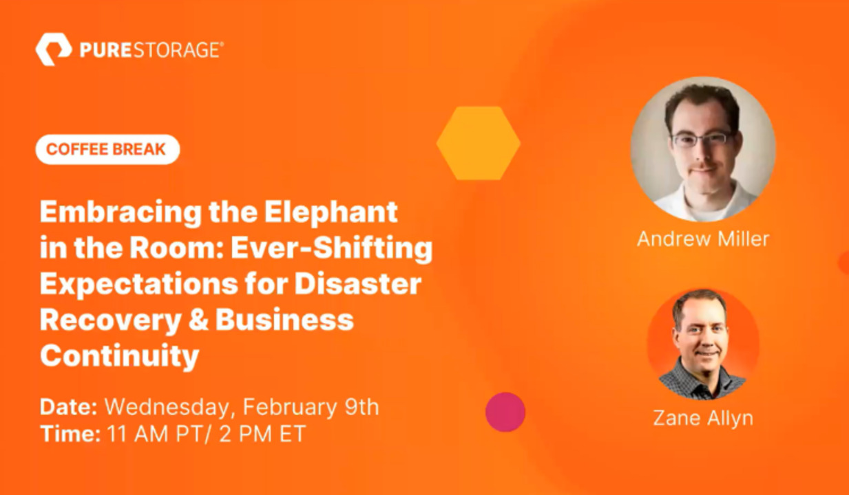 加入安德鲁·米勒(Andrew Miller)和赞恩·艾琳(Zane Allyn),因为他们从第一次咖啡休息中重新审视一个无序的话题 - 所有事物数据保护(灾难恢复,业务连续性,备份和恢复)以及纯粹的帮助。